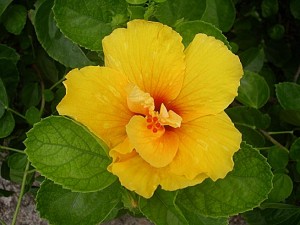 Golden yellow hibiscus is planted on the front side of the cloister.