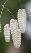 Native to the Mediterranean area, this annual grass has naturalized in many other parts of the world including western US. It has many common names including blowfly grass, rattlesnake grass, pearl grass, and shell grass. The plant forms dense clumps of pale green leaves eight inches long, and has loosely arranged oval clusters of tiny delicate flowers that hang from fine thread-like stems. Each stem has about ten flower-clusters, each .4 to .8” long. The flowers are produced from spring until late summer and are green when they first appear but become medium green and then straw colored as they mature. Although cultivated in some areas, quaking grass is considered a weed in others. Plants self sow. Excellent for dried arrangement. The genus name, Briza, is the Greek name for one of the food grains, possibly rye. The specific epithet, maxima, is the Latin word meaning very large and refers to the flowerheads.