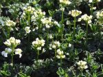 A stoloniferous herbaceous perennial, running rock cress is a member of the mustard family, Brassicaceae, that also includes cabbage, alyssum, and candytuft. It is native to Southern Europe where it grows in mountainous meadows, fields, and disturbed areas. Plants form low dense mats of glossy, bright green persistent foliage with pointed basal leaves that are smooth above and hairy along the veins and margins of the underside. In spring, terminal loose racemes of 3/4″ white cruciform flowers are carried on stems with scattered small ovate leaves. A variety with white-edged leaves, A. procurrens ‘Variegata’, is available. Spreading rock cress is vigorous even in dry poor soil and is suitable for rock or alpine gardens.
