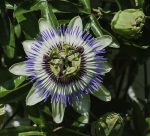 Blue passionflower likes full sun to partial shade and average, medium moist, well-drained soil in USDA Hardiness Zones 7-9. Plants need good air circulation to control fungal diseases in humid conditions and should be watered deeply but infrequently to encourage a deep root system. Prune before new growth begins by removing some stems at ground level but alway leave some greenery on the plant. Pinch tips after flowering to encourage bushiness and fertilize sparingly so as not to encourage foliage at the expense of flowers. Numerous fungi may damage the plant and butterfly larvae may devour the foliage. Propagation is by seed, stem cuttings in spring, layering in late summer. Blue passionflower gives a tropical look to gardens and greenhouses. With its showy blooms it is a good choice for walls, fences, arbors, and containers and will not cause damage because it climbs by tendrils. Can become invasive.