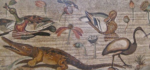 The plants are anchored in the mud by a rhizome that spreads and form colonies. The green waxy leaves are up to two feet across and are held above the surface of the water on stems up to 6 feet long that are attached to the center of the leaf-back. The cup-shaped pink or white flowers are eight to twelve inches across and are produced on erect stems above the foliage. They open during the day and close at night over a period of about three days. In the center of each flower is an inverse-cone receptacle that is two to three inches across and bears the nut-like seeds that can live for up to 1300 years. The receptacle, which differentiates lotus from water lily, becomes woody and is depicted in the middle part of the mosaic from the House of the Faun shown above.