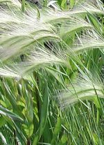 Description: With a shallow fibrous root system, foxtail barley forms a clump 1-2 feet tall and has gray-green leaf blades that are 1/8 to 1/4 inch wide and are rough on the upper surface. The flowerhead appears in early summer and is a nodding spike two to five inches long. It is green with reddish or purplish tints before becoming tan and brittle. The awns are sharp, up to two inches long, and have backward pointing barbs so are dangerous for foraging cattle or wildlife. Plants spread primarily by seeds that remain may remain viable in the soil for up to five years.