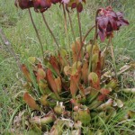 The Pitcher plant is a great favorite for bog gardens and is sure to pique the interest of every garden visitor. Insects are attracted to the funnel shaped leaves that grow in rosettes resembling a flower and to the nectar produced by the red veins. When the insects get to the curve in the funnel tube they are prevented from going back up by downward pointing hairs. They end up in the water, dew, and digestive enzyme mixture at the bottom of the tube where they are digested. This method of obtaining nutrients is not essential for their survival.