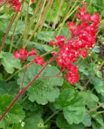 Native to  the cliffs,hills and alpine areas of Arizona and New Mexico, this evergreen herbaceous perennial is a member of the saxifrage family, Saxifagaceae, that also include tiarella, bergenia, and astilbe.  Plants forms a 8-10″ wide clump of  leaves carried on softly hairy petioles up to 5″ long.  The leaves are 1-2″ wide, rounded to kidney-shaped, and have 5-7 toothed lobes. In late spring bell-shaped red flowers 1/2″ long appear in loosely branched panicles 10-20′ long and persist for 4-8 weeks. H. sanguinea is a parent of most of the hybrids in gardens today and are usually listed under H x brizoides.   With their long bloom time, plants are a good choice for rock gardens, borders, and woodland gardens but also are good as a ground cover.  The  genus name, Heuchera, honors Heinrich von Heucher (1677-1747) a botanist, physician, and medicinal plant expert at Wittenberg University, Germany.   The specific epithet, sanguinea, comes from the Latin word sanguis meaning blood and refers to the color of the flowers.