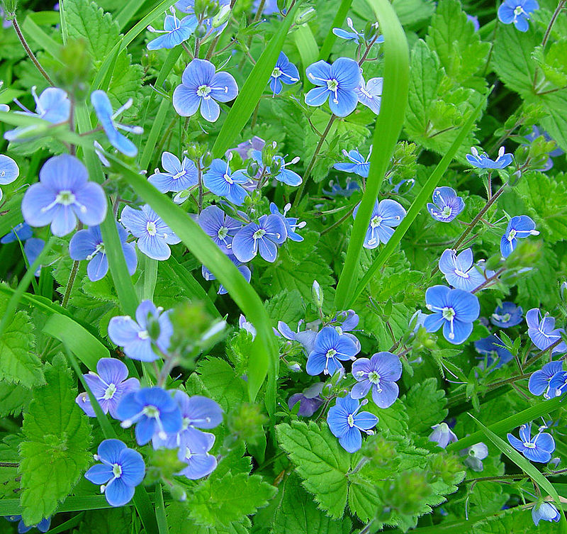Also known as bird’s-eye speedwell, and cat’s eyes, this herbaceous perennial is native to Europe where it is found in meadows, hedgerows, and open deciduous woodlands. It is a member of the plantain family, Plantaginaceae, that also includes foxglove, snapdragon and Angelonia. The plant grows up to 8″ tall but is usually shorter and has stems that have fine white hairs on opposite sides. The oval leaves are sessile, and have deeply toothed margins . From spring into summer, blue (occasionally mauve or pale violet) flowers appear. Each flower is 3-4″ across and has a white center surrounded by 4 petals with dark blue radial lines. The plants can become weedy if they invade a lawn. They spread by producing roots at the stem nodes and regenerate from stems even when the leaves are gone. In the past, the leaves have been valued for making an expectorant teas for treating bronchial congestion and asthma. The genus name, Veronica, honors Saint Veronica who is said to have given a handkerchief to Jesus on his way to Calvary so he could wipe sweat from his face. The specific epithet, chamaedrys, is from the Greek words χαμαi (chamai) meaning on the ground, and δρῦς (drys) meaning oak, and refers to the habit of the plant and the supposed resemblance of its leaves to oak leaves.