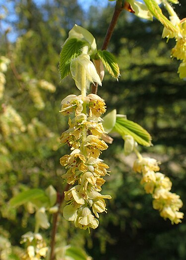 Native to the montane forests of Assam, East Himalaya, Myanmar, and Tibet, this deciduous shrub or small tree is a member of the witch hazel family, Hamamelidaceae, that also includes fothergill and loropetalum. It grows 10-15′ tall and has a dense canopy of oval, blue-green, finely toothed leaves that are up to 4′ long and have felted undersides. In early spring before the leaves appear, nodding, 1-2″ long racemes of very pale yellow, lemon scented, bell-shaped flowers appear. Each raceme has up to 30 flowers. Himalayan winter hazel is a good choice for mixed border as well as for use in woodland and fragrance gardens. The genus name, Corylopsis, is derived from the Greek words korylos which means hazel and opsis which means like or resemblance and refers to the fact that the leaves are similar to those of hazel plants. The specific epithet, himalayana, refers to the region where the plant is native.