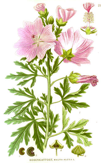 Also known as greater musk-mallow, cut-leaved mallow, and vervain mallow, this herbaceous perennial native to Europe and southwestern Asia. It is a member of the mallow family (Malvacae) that also includes hibiscus, hibiscus, cotton and okra. Stout branched stems carry downy, light green leaves that are rounded, up to six inches long, and have toothed margins and five shallow lobes. The pink to light rose-purple flowers have five notched, two-lobed petals and bloom over four to six weeks beginning in early summer They are two to three inches wide and are carried both along the stem and in terminal spikes. Plants do best in USDA Zones 6 and cooler, as they are susceptible to a bevy of insects and diseases in warmer climates. The genus name, Malva, comes from the ancient Greek word μαλάχη (malache) meaning soft or soothing referring to the plant’s mucilaginous properties, which have been used in traditional medicine to soothe inflammation and irritation.. The specific epithet, alcea, is from the Greek word ἀλκή (alke) meaning strength or healing referring to the plant’s traditional medicinal use. Photo Credit: Wikipedia