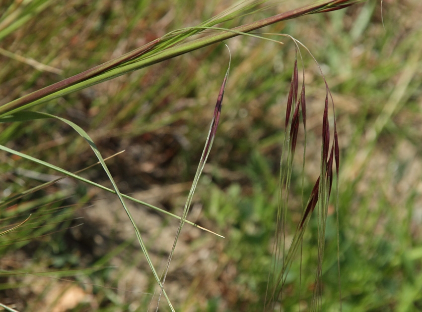 This perennial bunch grass is native to California where it grows in a variety of habitats including grassland, chaparral and oak woodland. It is a member of the grass family Poaceae, that also includes rice, corn and bamboo. The plants grow up to 3.3′ tall and form dense tussocks of erect, unbranched stems with linear green leaves that are smooth to finely hairy. In early to mid summer, flowers are produced in open, nodding clusters 4-8″ long and consisting of many branches bearing spikelets. The seed florets are .3-.4″ long and have a hairy lemma and a twice-bent awns that are 1.5-4″ long, and are purple at first, turning to light wheat color with maturity. Each plant yields an abundance of seed before going dormant until the rains return. The root system can be up to 20′ deep in the soil making the plant very drought tolerant and a good choice for erosion control or a xeriscape where it can be used for a ground cover or combined with other drought tolerant plants to make a meadow or prairie garden. Purple needle grass provides food and/or shelter to butterflies, birds, and mammals, including elk and deer, but is generally not used as forage for livestock. The genus name, Stipa, is from the ancient Greek word στύππη (stúppē) meaning fiber. The specific epithet, pulchra, is the Latin word meaning beautiful. Photo Credit oliveoligarchy Wikimedia Commons