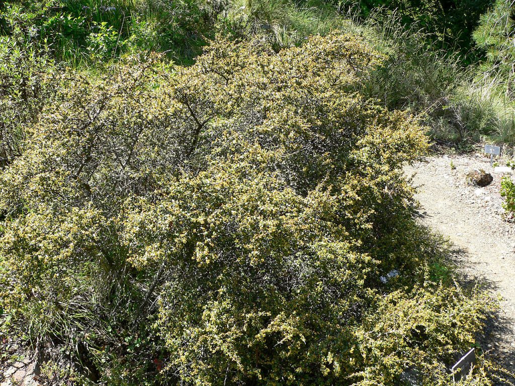 Also called hollyleaf buckthorn, this evergreen shrub is native to Baja California, California and Arizona, where it grows in dry washes and canyons in coastal sage scrub, chaparral, and various woodlands. It is a member of the buckthorn family, Rhamnaceae, that also includes California lilac, jujube tree, and crown of thorns. The shrub grows 4-6′ tall and has multiple branches, some tipped with thorns. The tiny glossy, round leaves are dark green on top and brown or yellow on the underside. In spring, clusters of 1-6 inconspicuous, whitish-green, male and female flowers appear but under stress the plant may produce only male flowers. The fruit is an edible, pea-sized, red berry that is attractive to birds and is said to give a red tinge to people who eat it in large quantities. The plant serves as a larval food source for Hermes copper and pale tiger swallowtail butterflies, and western tussock moth. Tolerant of pruning and drought, the shrub is useful as a hedge and for erosion control. The genus name, Rhamnus, comes from the ancient Greek word ῥάμνος (rhámnos) referring to various prickly shrubs. The specific epithet, crocea, is the Latin word meaning saffron-colored. Photo Credit Stan Shebs Wikipedia Commons