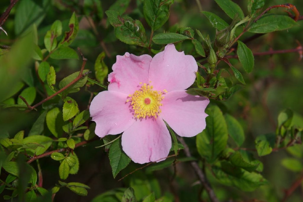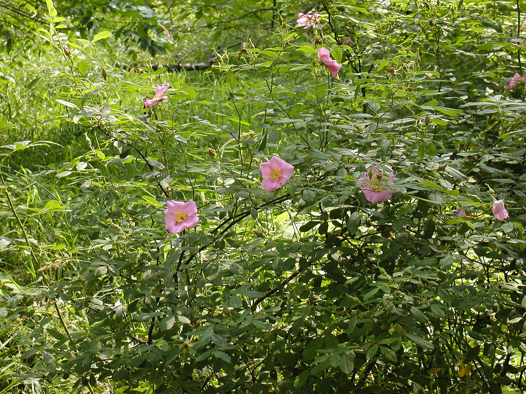 This suckering deciduous shrub is native to eastern North America from Nova Scotia and New Brunswick, south to Florida and west to Arkansas and Ontario where it occurs along stream banks and in swamps, marshes, and floodplains. It belongs to the rose family, Rosaceae, that also includes cherry, lady’s mantle, and photinia. Swamp rose is upright, grows 3-6′ tall and wide, and has arching branches with stout curved prickles. The pinnately compound leaves have 5 to 9 (usually 7) finely toothed leaflets that are broadly elliptic or ovate, 1.25- 2.5″ long, and pointed at both ends. They are medium to dark green during the growing season and often turn red in the fall. Single, 5-petaled pink flowers with conspicuous yellow stamens appear from late spring to mid summer and last 6-8 weeks. They are 1-2″ across and very fragrant so attract bees, butterflies, and other pollinators. The red pea-sized fruits that follow (hips) are fleshy, filled with seeds, and eaten by birds and small mammals. Swamp rose is an excellent choice for use in native plant, pollinator, butterfly, wildlife, bog and rain gardens. The genus name, Rosa, is the Latin name for the plant. The specific epithet, palustris, is the Latin word meaning swampy and refers to the plants favorite habitat. Photo Credit: SB Johnny Wikimedia Commons