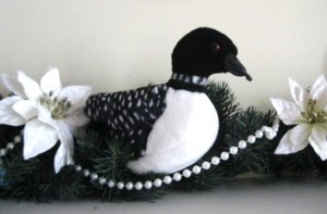 A loon sits on the mantel with a couple of owls and a hawk. His black and white coloring is striking but his call is the best of any bird in my collection.