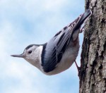Everybody loves nuthatches! And why not? Their habit of running up and down trees at various angles captivates the eye of those who see them; they will come to your feeder for suet and big meaty seeds at all times of the year providing good entertainment for bird watchers, You might see one hacking away at a nut to get at the meat but it may fly to a tree and either hide the seed in the bark or hack it open there. They also find insects in tree bark and get the ones that other birds like wood peckers don’t see. Most insect eating birds view the insects in bark from an upright position but nuthatches walk upside down and see them from a different angle so they can get the insects the other birds missed. They have very strong legs and feet and can hang upside down from twigs and branches. You may see them in the company of titmice and chickadees.