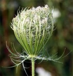 A native of Europe and southwest Asia, this tough biennial has naturalized in Canada and US where it grows in disturbed sites and has become invasive in many areas and is considered a noxious weed. Queen Anne’s lace is a member of the carrot family (Apiaceae) and related to celery, dill, angelica, cilantro, and parsley as well as to poison hemlock. It is also the plant from which all cultivated carrots were cultivated. The leaves are roughly triangular in shape, tripinnate, and finely divided. The small cream-colored flowers are carried in dense flat umbels up to three inches across from May to October. Some flowerheads have a single red to purple flower in the center which is believed to attract insects. As the flower heads mature they curl up to form a bird’s nest like structure. Care should be taken when handling the plant because the leaves can cause skin irritation in susceptible individuals.