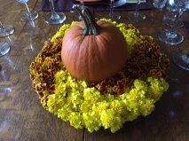 Place a small pumpkin or other focal point in the center if desired. The pumpkin centered the arrangement and gave height but a candle, votive or other three.
