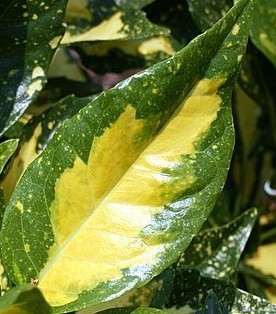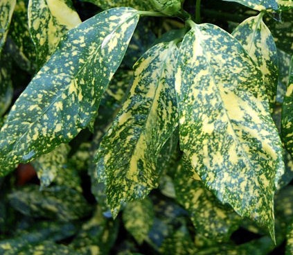 Spotted laurel is a broad leaf evergreen shrub native to China, Japan and Korea where it grows in moist forest soils. Its variegated forms are very useful in both the garden and flower arrangements because of the color and texture of the foliage that is the main reason for growing the plant. The leaves may be all green or variegated by a sprinkling of yellow-to-yellow leaves edged with green. They are two to three inches long, l-2 inches wide, and glossy. Male and female flowers are usually on different plants and are small (less than 1/3 inch). They have four purplish brown petals, and are produced in loose clusters of ten to thirty. The fruits are small scarlet berries about 1/3 inch across and are not attractive to birds. Established plants are tolerant of drought, urban conditions, lean soil, salt spray, and dry shade. How can it get better than that?