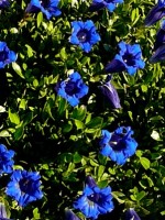 This evergreen herbaceous perennial is native to the mountains of southern and central Europe where it can grow in full sun but have cool roots. This is a very demanding plant that wants conditions to be a certain way and if you can provide them it will be a treasure. The Pacific Northwest is probably the best local for success. Plants form rosettes of dark green narrowly elliptical leaves that form slowly spreading mats. The bright blue trumpet shaped flowers are a little over two inches long and have green spots in their throats. They are carried in spring on short erect stems giving rise to their specific name, acaulis. This is a great choice for an alpine garden if you can provide the exacting demands of the plant. If you are lucky enough to be successful with trumpet gentian you will be rewarded with a stunning flower that adds a welcome touch of bright blue to the garden as well as to arrangements. They are only appropriate for small arrangements because of their short stems but will put an eye-catching snap into any arrangement where they are included. A small bunch in a white vase is also an eye-catcher.