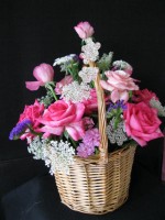 After I complete an arrangement I try to keep it in a cool place out of direct sunlight or drafts. Roses need a plentiful supply of water to keep their stems stiff and heads up so any strategy that cuts water loss is important. The best kind of arrangement for long lasting roses is one that has no foam, just fresh water, but then the container options are more restricted. A basket of roses has a certain look and you have to use foam to get it.