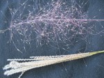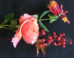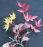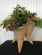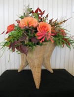 The cornucopia is a familiar symbol of Thanksgiving, so how about putting three cornucopias together for a large and smashing arrangement to grace the sideboard or serving table. The autumn coloration is the inspiration for the color scheme and the plants growing in my garden provide the foliage and flowers. If frost and cold weather have eliminated much of the vegetation in your area, pick what you can, and buy a bouquet at the super market to provide the rest. The key to success is plant material that provides a variety of textures and forms within a chosen color scheme. Create interest by varying some elements while keeping continuity by repeating others.