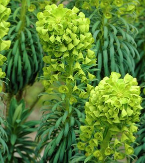 A native of the eastern Mediterranean area, this upright perennial grows rapidly and forms a bushy mound with evergreen leathery blue-green leaves. Large rounded lime-green flower heads are produced in early spring for a striking effect. Long lived, pest and disease free, the plant can be grown in containers and brought indoors in cold climates. Warning: The white milky sap is poisonous and can irritate the skin.