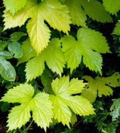 Hosta sieboldiana elegansColor is probably the most import characteristic to most gardeners but they forget that green is the most dominant color there. This is a very good thing because green is a very restful, relaxing color and a great background for all the other colors that the flowers bring into a garden. But as we all know, greens vary greatly. In fact, there are hundreds of different greens; Ireland alone claims to have 40 different ones. Since most gardens have more foliage than flowers at any given time, the kind of green is very important to the look of the whole garden as well as the beauty of individual or masses of flowers. Dark greens are especially good as background for bright colored flowers, while chartreuse and lime colored leaves can brighten an area without flowers.