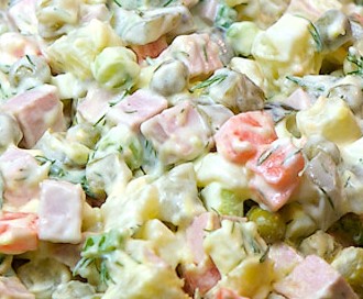 Olivier salad dates back to the 1860 when chef Lucien Olivier made the dish for the hermitage restaurant in Moscow. The ingredients included grouse, duck, veal tongue, caviar, crayfish, and lettuce bound together with a special mayonnaise made with Provencal olive oil. Over the years the ingredients have changed considerably and now include diced potatoes, canned peas, pickles, cucumbers, hard boiled eggs, and some kind of meat often ham, salami, or chicken, all bound with special mayonnaise (that can be made at home in a blender). Depending on the region and the cook, the ingredients of the salad vary greatly. In Spain it is called Ensaladilla rusa (Russian salad) and is served in tapas bars. It usually has boiled and minced potatoes, carrots and eggs, tuna, roast red pepper strips, and green olives, again bound with mayonnaise. So if a salad is not to your liking for New Years consider trying this dish as a small plate with sherry.