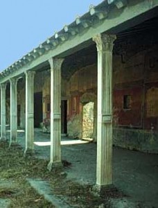 The houses of the wealthy ancient Pompeians usually were large and had many rooms organized around an open space. The open space was used as a garden and was surrounded by a colonnaded walk called a peristyle. Before the aqueduct was extended to Pompeii, the garden was devoted to trees, especially fruit trees, rather than shrubs and herbaceous plants because trees needed abundant water only one year to become established. After the aqueduct came to Pompeii, shrubs and herbaceous plants were included in the garden.