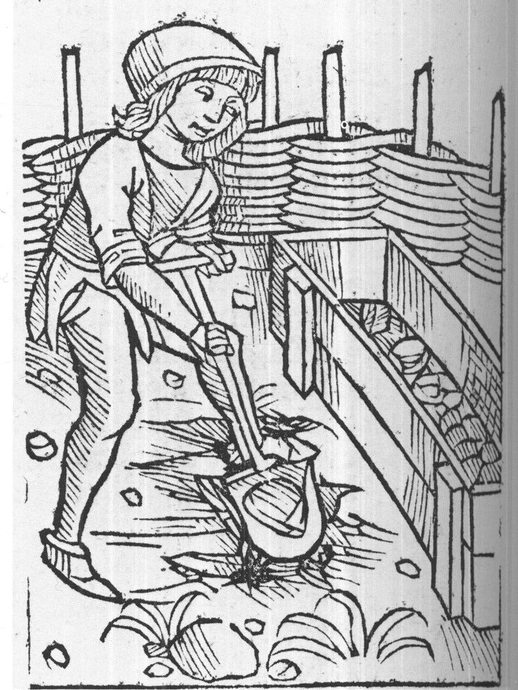 The bench in the picture is U-shaped but benches were usually rectangular, less often cicular or L -shaped. The sides could be made of wattle fencing, wood planks, brick, or stone, filled with rocks and then soil, and topped with grass, sometimes with flowering plants included. Occassionally, as shown here, the sides were also covered with turf. A woodcut by the Crescenzi shows us a workman constructing a bench using wood planks. The bench in the woodcut is rectangular and filled with rocks ready for soil and then grass.