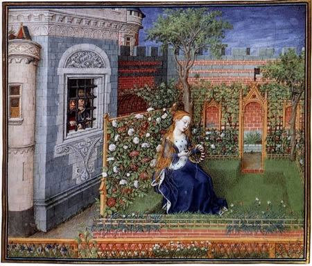 This scene by Barthelemy d’Eyck is from the manuscript, Teseida, an epic poem written by Giovanni Boccaccio c. 1340-1341. It shows Emily, the younger sister of the amazon Hippolyta, sitting in her garden while her would be suitors, Arcita and Palemone, watch her from the window of their prison cell. The suitors were captured at the end of the Theban War by Theseus, hero of the poem, and imprisoned in Athens where they fell in love with Emily when they heard her singing outside their window.