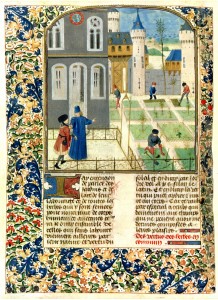 There are several different types of parterres with variations of each type. The simplest version of this design feature can be seen in illuminated manuscripts written by Pietro de Crescenzi in the 14th century. Rectangular beds are laid out neatly in a grid with wooden planks edging and defining the sides. Inside the beds are trees and other plants