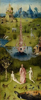 The Garden of Eden is a symbol for paradise and so takes on the attributes that society associates with a perfect place. Water, trees, animals, and Adam and Eve are included in the Biblical account but the garden could certainly have contained much more plant material and hardscape. Bosh even puts in fantastic creatures and plants.