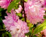 The double flowered dwarf almond is a small deciduous shrub growing 2.5′ high and a member of the rose family, Rosaceae that also includes peaches, lady’s mantle and pyracantha. It is native to China and Japan but was introduced to the US in the early 1800s as an ornamental. Flowers appear in early spring just as the leaves emerge. They are usually pink, about 3/4 inches across, and cover the entire bush. The leaves are medium green and have finely toothed margins. Plants flower best in full sun with consistently moist well-drained soil.