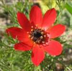Also called red Morocco, blooddrops, red chamomile, rose-a-ruby and soldiers-in-the-green, this colorful annual is a member of the buttercup family, Ranuncluaceae, that also includes anemone, hellebore, and nigella. It is native to Western Asia, Europe, and North Africa where it grows in a variety of soils in full sun to part shade. Growing from a taproot, it reaches ten to twelve inches high and has finely cut leaves and terminate scarlet flowers with darker spots at the base. In spite of its specific name, autumnalis, it blooms throughout the summer. The common name, Adonis, is derived from the ancient Greek youth whose blood colored the flower that bears his name.