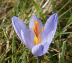 This perennial corm is native from southern Turkey to southwest Syria but found on rocky hillsides and open woods from North Africa to Palestine and Armenia. It is a member of the iris family, Iridaceae, that also includes gladiola, freesia, and crocosmia. The plant grows up to 4″ tall and has gray-green grass-like leaves. In the fall, slender, stemless flowers appear with a pale blue corolla marked with dark violet strips on the inside. Photo Credit Meneerke-Bloem Wikipedia