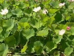 The lotus is associated with Job in the Bible and some scholars have identified it as Nelumbo nucifera, the sacred lotus of Egyptian fame. It is an aquatic perennial native to tropical Asia and Australia, and has been cultivated in China for over 3000 years for its ornamental medicinal and culinary value. The plants are anchored in the mud by a rhizome that spreads and form colonies. The green waxy leaves are up to two feet across and are held above the surface of the water on stems (petioles) up to 6 feet long that are attached to the center of the leaf-back. The cup-shaped pink or white flowers are eight to twelve inches across and are produced on erect stems above the foliage. They open during the day and close at night over a period of about three days. In the center of each flower is an inverse-cone receptacle that is two to three inches across and bears the nut-like seeds. The receptacle, which differentiates lotus from water lily, becomes woody and is valued for dried arrangements. The seeds are very long lived and 1300 year old seeds found in China have been germinated.