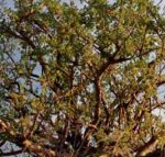 This woody perennial tree or shrub is native to northeast Africa and the Arabian peninsula and is a member of the Torchwood family, Burseraceae, that also includes frankincense. Plants may be short and spiny with small leaves or up to 9′ tall, unarmed, and with large leaves, depending on the avaiablity of rain. The trunk is stout and carries many branches that are at right angles and may end in sharp spines. The outer bark is silvery to gray and oozes a pleasant smelling resin when it exfoliates. The resin is highly valued for its use in cosmetics,medicines, insect repellents, and embalming compounds. The glossy green leaves are hairless, roughly toothed, and pinnately compound usually with oval leaflets. Small yellow-red female and male flowers are carried on stalks, female flowers singly,male flowers in clusters. The small brown fruit is oval, flattened, and has a tapered point. Photo Credit Wikipedia