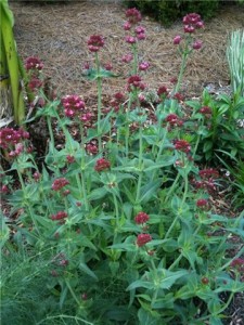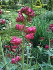 Elsewhere in the same border valerian, Centranthus ruber, has begun. The pink flowers are nicely set off by the lovely blue-gray foliage.