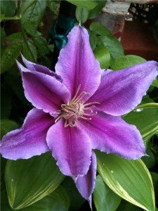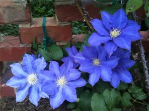 A blue large flowered clematis, ‘Little ugly Duckling’, has its feet in the secret garden but has been trained to grow through the holes in the wall. The shoots in the shade of the wall are covered with buds.