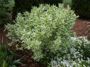 The variegated leaves of another red twig dogwood, Cornus alba ‘Elegantissima’, are complemented by the white flowers of sweet woodruff.