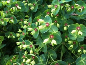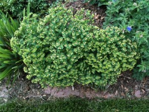 ‘Tiny Tim’ euphorbia is blooming in its inconspicuous way. Note the single bright blue blossom of Geranium ‘Johnson Blue’.