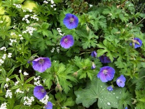 Both the blue of ‘Little Ugly Duckling’ and the rose of ‘Dr. Ruppert’ are picked up by my earliest cranesbill, Geranium himalayense with its blue flowers tinged with rose.