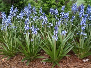 The bed of Spanish bluebells (Hyacinthoides hispanica) is full of color. Although these blue flowers are in full bloom, the pink ones are not.