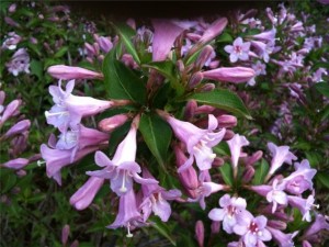 The old fashioned shrub, weigela is just beginning to open. My mother loved her weigela in the garden of our family home in Manhasset, N. Y. and it grows just as well here in North Carolina.