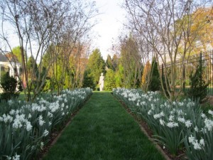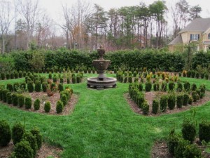 The bright apple green of the boxwoods that edge the parterres of the rose garden are always a sure sign that spring is here and the color display of the roses is not far off.