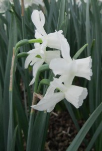 The daffodil ‘Ice Follies’ has faded and been deadheaded while the fragrant narcissus ‘Thalia’ has come into bloom. ‘Thalia’, also known as the “Orchid Narcissus” is a triandrus narcissi, producing up to five pendant flowers per stem.