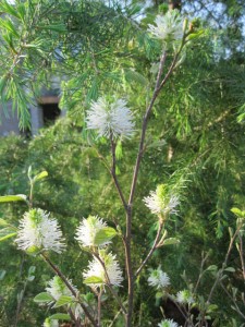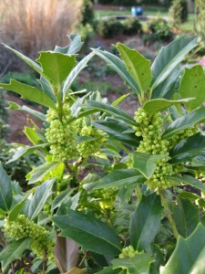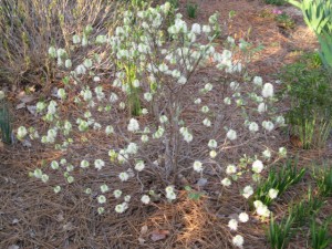 The oakleaf hollies are covered with buds that we hope will produce equally dense clusters of berries by fall. Unlike most hollies, their flowers have both male and female parts so we don’t have to worry about a male pollinator being in the neighborhood.