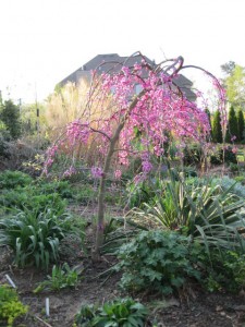 The weeping redbud has come into flower bearing its bight pink flowers in a cascade to the ground.
