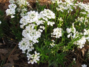 The candytuft looks crisp and white and is the first perennial blooming in the white border.