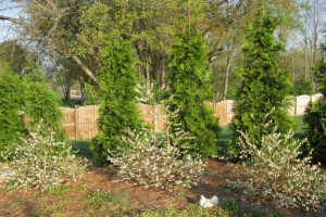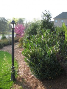 At the front of the house a ‘Oklahoma’ redbud combines with cherry laurel to make a nice background for the lamp post that will be soon be covered with the clematis ‘Jackmani’.