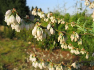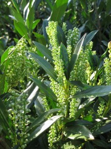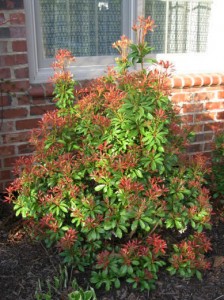 Like some roses, Andromeda ‘Mountain Fire’ provides color with its new growth. The shrub has cream-colored clusters of lily of the valley like flowers but the eye catching features is the red of the new leaves.
