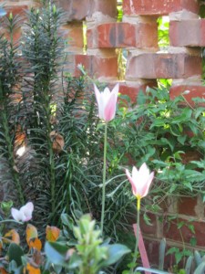 The species tulip, Tulipa clusiana ‘Lady Jane’ are blooming on their tall slender stems for the second year.